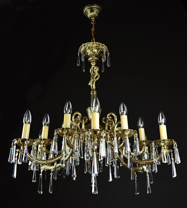 Sở hữu kích thước ấn tượng, đèn chùm Pisces XII Alpha Gold nổi bật với 12 tay đèn đối xứng được đỡ bởi hệ khung đồng mạ vàng công phu. Mỗi tay đèn được bao phủ bởi pha lê cắt dọc sắc nét, tạo nên hiệu ứng ánh sáng lung linh, sắc sảo và hoàng gia. Điểm nhấn đặc biệt nằm ở chi tiết điêu khắc nghệ thuật hình cậu bé bằng đồng tại thân đèn trung tâm – một biểu tượng độc bản, thể hiện chiều sâu văn hóa và sự tinh tế của chủ nhân. Đây không chỉ là đèn chiếu sáng, mà là một tác phẩm nghệ thuật treo giữa không gian, cân bằng hoàn hảo giữa sự tráng lệ và tinh xảo, mạnh mẽ và mềm mại.